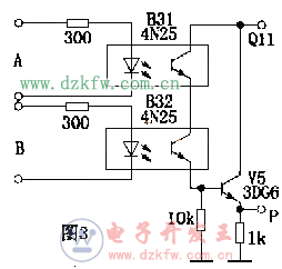 圖3電路為“與門”邏輯電路。其邏輯表達式為P=A.B.圖中兩只光敏管串聯,只有當輸入邏輯電平A=1、B=1時,輸出P=1.同理,還可以組成“或門”、“與非門”、“或非門”等邏輯電路.