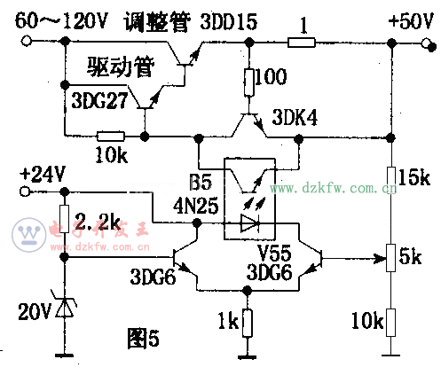 電路如圖5所示.驅動管需采用耐壓較高的晶體管(圖中驅動管為3DG27)。當輸出電壓增大時,V55