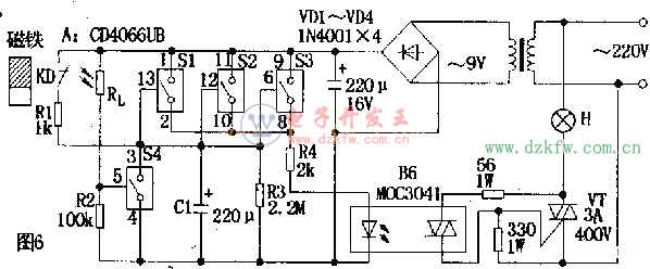 電路如圖6所示。A是四組模擬電子開關(S1~S4):S1,S2,S3并聯(可增加驅動功率及抗干擾能力)用于延時電路,當其接通電源后經R4,B6驅動雙向可控硅VT,VT直接控制門廳照明燈H;S4與外接光敏電阻Rl等構成環境光線檢測電路。當門關閉時,安裝在門框上的常閉型干簧管KD受到門上磁鐵作用,其觸點斷開,S1,S2,S3處于數據開狀態。晚間主人回家打開門,磁鐵遠離KD,KD觸點閉合。此時9V電源整流后經R1向C1充電,C1兩端電壓很快上升到9V,整流電壓經S1,S2,S3和R4使B6內發光管發光從而觸發雙向可控硅導通,VT亦導通,H點亮,實現自動照明控制作用。房門關閉后,磁鐵控制KD,觸點斷開,9V電源停止對C1充電,電路進入延時狀態。C1開始對R3放電,經一段時間延遲后,C1兩端電壓逐漸下降到S1,S2,S3的開啟電壓(1.5v)以下,S1,S2,S3恢復斷開狀態,導致B6截止,VT亦截止,H熄來,實現延時關燈功能。