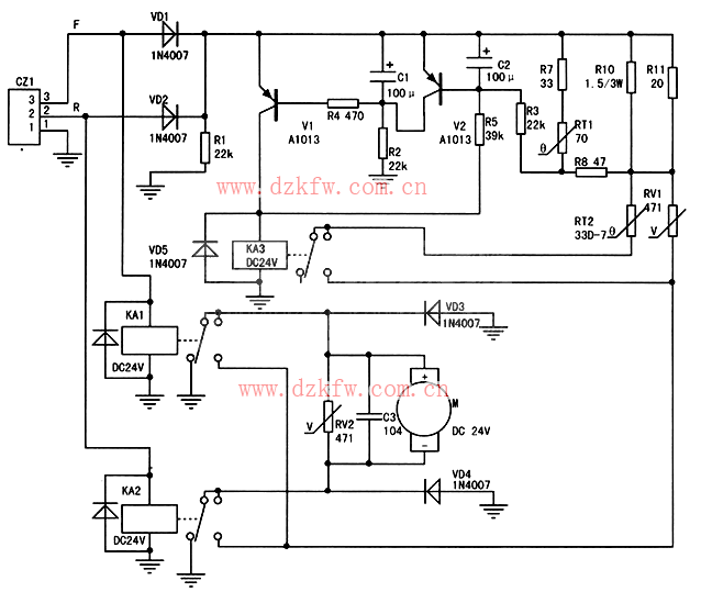 在輸入端F加入24V直流電源,KA2不得電,KA1線圈得電,觸點閉合為電機正(或反)向提供電源通路,同時24V直流電源通過VD1加入檢測電路,檢測電路使得KA3動作,觸點閉合電源通過R5、R2、Rl和Rl0、Rll支路,RT2,KA3的動合觸點,KA1的動合觸點加到直流電機的一端,直流電機的另外一端通過KA2的動斷觸點接地,實現(xiàn)了電機的正(或反)轉(zhuǎn),當開窗到位時,電機堵轉(zhuǎn),電流增加,檢測電路使KA3動作,電機失電而停轉(zhuǎn)。當在電路的R端加24V的直流電源,器工作原理和上述過程基本類似只是KA1不得電,KA2得電,電機反(或正)轉(zhuǎn)。加入VD1和VD2隔離了輸入的正或反向的工作電壓,保證電路按需動作。