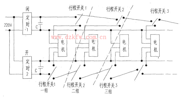 2.當定時器2定時開啟,電機運轉,窗簾打開,窗簾到頭,行程開關l常閉點斷開,常開點關閉,下一組窗簾盒開始打開,如此可控制多組窗簾盒。