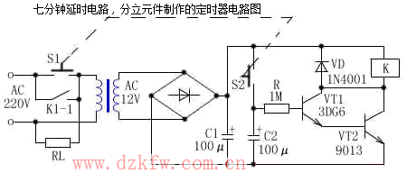 延時(shí)時(shí)間的長短由C2和R的時(shí)間常數(shù)決定,改變C2或R的數(shù)值可以改變延時(shí)時(shí)間的長短(按圖中數(shù)值延時(shí)約7分鐘),加大C2或R的數(shù)值,延時(shí)時(shí)間變長,反之時(shí)間變短。
