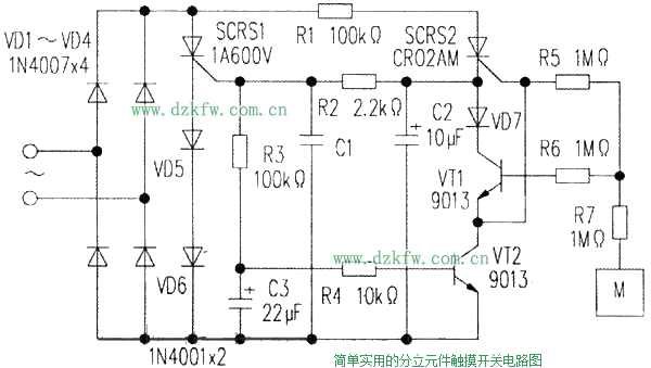 二極管VD1—VD4構成橋式整流,可控硅SCRS1在電路中進行電源通斷控制。小電流觸發可控硅SCRS2實現觸摸開的控制,三極管VT1實現觸摸關的控制。平時可控硅SCRS1和SCRS2均處于關斷狀態,整個電路沒有任何功耗。當人體的手指觸摸一下金屬片M時,人體感應信號使可控硅SCRS2和三極管VT1均導通,但是,由于控制三極管VT2截止,只有SCRS2的導通起到作用,結果使可控硅SCRS1得到觸發電流而導通,電器得電工作。可控硅SCRS1導通后,其控制極上會得到一個電壓(實測此電壓約為2.35V,與所接的電器功率大小有一些關系,但關系不大),此電壓經電阻R3向電容C3充電,一定時間后,控制三極管VT2得電導通。此時再觸摸金屬片M,經電阻R5的人體感應信號因被三極管VT2旁路,將無法加到可控硅SCRS2的控制極,SCRS2不再起作用。而經電阻R6的人體感應信號加到三極管VT1后,由于VT1和VT2均導通,可以對電容C2上的電荷進行釋放,結果可控硅SCRS1在交流市電過零時關斷。按圖中電阻R3和電容C3的取值,約要延時0.5秒三極管VT1才能起作用,即要經過0.5秒后再觸摸M時,才能讓SCRS1關斷。按圖中電阻R4和電容C3的,取值;約要經過1秒后再觸摸M時才能讓SCRS1導通。如果摸住金屬片M不放的話,則會出現可控硅SCRS1一會兒導通、一會兒又關斷,如此不斷循環的狀態。有的人可能會問:SCRS1導通后,其陽極和陰極之間的電壓會降到1V左右,這時SCRS2本身就不再起作用了,為何還要在SCRS2控制極和VT2集電極之間加接一根短接線呢?實際情況是:當SCRS1導通時,VS2是不再起作用了,但在觸摸M使VT2導通時,對應SCRS1馬上關斷,其陽極陰極之間的電壓就會馬上升高,SCRS2不就又可以起作用了。如果沒有這根短接線,因為人體的感應信號,SCRS2、VT1都將導通,而VT2此時還處于導通狀態,結果SCRS1將出現部分導通,而不是全開或全關,這是不行的。圖中二極管VD5、VD6起提升VS1控制極的電壓作用。VD7的作用是三極管VT1被觸摸導通后,不會對可控硅SCRS2控制極和陰極之間造成短路。C1是抗干擾電容,采用0.1μF瓷片電容。
