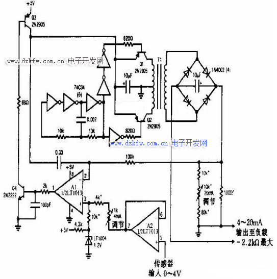 電流電路變送器電路圖注:電路變送器的精度為12位。1%薄膜電阻,T1為PICO-31080。LT1013見說明。