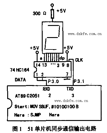 74××164芯片與51單片機的連接見下圖,單片機要一位一位移送,編程序很費力。其實不然,SBUF是51單片機的一個負責串行通信的特殊功能寄存器。51單片機執行一條串行發送指令MOVSBUF,A后,不僅把數據從源傳送到SBUF,而且自動啟動一次串行發送,在以下的8個機器周期內依次將SBUF中的8位數據通過RXD線輸出。