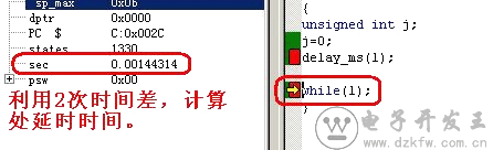 此方法得出延時函數,在晶振不同的情況下,延時時間會不準。軟件調試結果,這個程序的延時時間為:1.01779ms,一般的單片機系統中都可以應用。