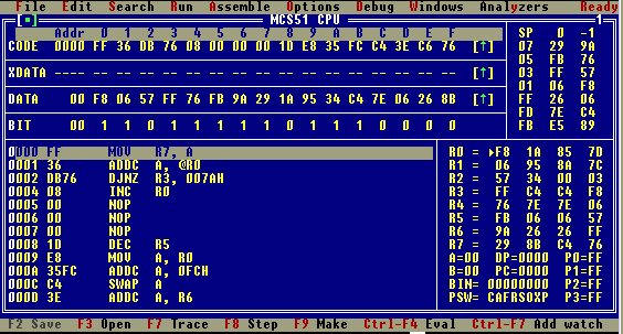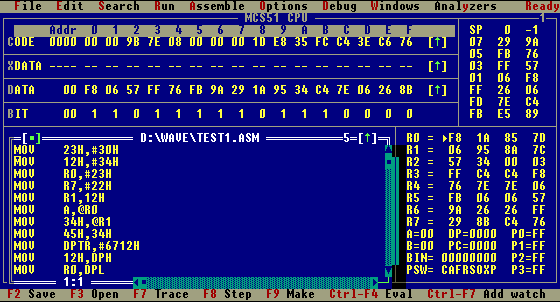 - 在空白處將上面的程序輸入。見圖4。用ALT+A匯編通過。用F8即可單步執(zhí)行,在執(zhí)行過程中注意觀察屏幕左邊的工作寄存器及A累加器中的值的變化。