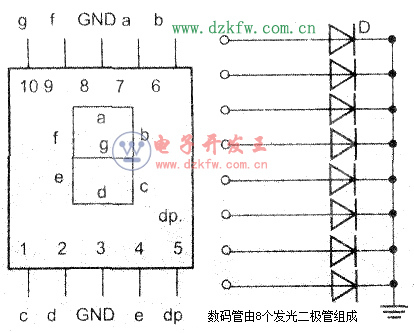 數碼管又分為共陰極和共陽極兩種結構,如下左圖所示為共陰極數碼管的外型結構示意圖。下右圖為共陰極數碼管的內部結構圖。