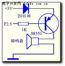 AT89C51單片機的P2.5口控制一個8550的三極管,三極管控制電磁蜂鳴器的電源通斷。
