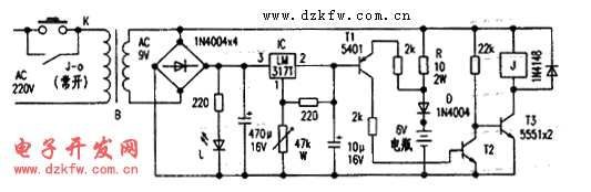 元件選擇 R為充電限流電阻,可在5~10歐間選取,其它元件無特殊要求。所有元件可搭接在一塑料盒上,Ic可不用散熱器。調試 短接K,調W使IC輸出電壓為電瓶充滿電壓7.5V即可。