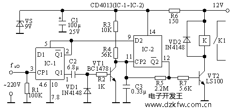 電路中,CD4013中的第一觸發(fā)器IC-1組成一個雙穩(wěn)態(tài)觸發(fā)器,用來對輸入的電源信號整形和二分頻。由它的Q1端輸出的分頻信號作為開光管VT1的開關控制信號。第二觸發(fā)器IC-2的R3、R4、R5及C3組成頻率檢測電路,當電源頻率超出規(guī)定范圍時,頻率檢測電路輸出檢測信號使VT2導通,切斷電源。當雙穩(wěn)態(tài)觸發(fā)器輸出脈沖的下降沿使VT1截止時,電容C3通過R3、R4、R5進行充電,如果電源頻率較低,電容充電時間將延長,C3上端的電壓將會升高,通過R5與R7分壓后會使VT2導通,繼電器吸和,它的常閉觸點將電源斷開。在電源頻率正常時,由于開關管VT1關斷的時間小于電容C3的充電時間常數(shù),C3上端的充電電壓達不到VT2的導通電壓,被控設備將正常工作。
