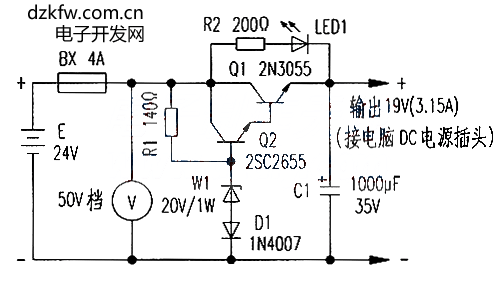 原理:在圖1中,24v 的電壓一路經BX加到Q1集電極;另一路經R1、W1、D1,Q2、Q1組成的穩壓電路穩壓后使Q2、Q1相繼導通,并從Q1發射極輸出一個穩定的19v(3.15A)電壓,替代原來的交流穩壓電源,向電腦供電。