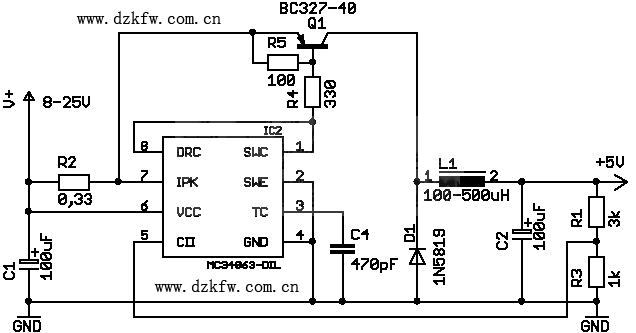 MC34063擴流降壓電路圖,輸入8~25V,輸出5V,適用于單片機電源,USB電源,手機充電等。
