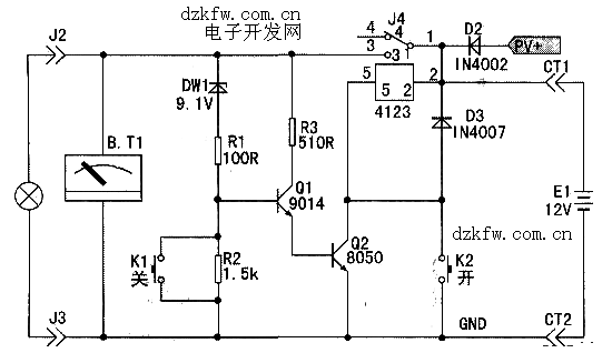電路是由蓄電池、控制器、用電器及充電部分組成。其中:穩壓二極管DWl、電阻R1、R2組成欠電壓檢測電路,三極管Q1、Q2及電阻R3和繼電器組成欠電壓自動斷電控制、執行電路。K1、K2分別為手動“關”、“開”機按鈕開關,PV+是太陽能電池板充電輸入正極接線端。負載最好用直流1 2V電子節能燈。