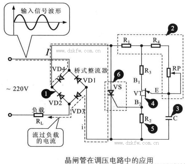 220V交流電壓經(jīng)過橋式整流器(圖中1)后,通過R1,R4以及RP(圖中2)為電容器C(圖中3)充電,當(dāng)電壓達到單結(jié)晶體管VT(雙基極二極管,圖中4)峰點電壓時,VT由截止變?yōu)閷?dǎo)通,電容C通過雙基極管VT的發(fā)射極、基極和R2后迅速放電,給晶閘管VS(圖中6)一個觸發(fā)信號,從而使晶閘管VS導(dǎo)通,由于晶閘管導(dǎo)通后其正向壓降很低,第一個正半周的達到最低點,即電源電壓為零時,晶閘管VS自動關(guān)斷。待下一個正半周到來時,電容C又充電,重復(fù)上述過程,只有晶閘管VS導(dǎo)通,才能有足夠的電流流過負載RL。