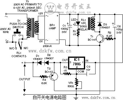 供給的另一個重要的特征是,它自動關閉無負載時,跨接在其輸出端。這是實現與晶體管T1和T2,二極管D1,D2和電容器C2的幫助下。當負載被連接在輸出端,潛在的二極管D1和D2(約1.3V)的壓降是足夠的晶體管T2和T1進行。其結果是,得到繼電器通電,并保持在該狀態下,只要負載保持連接。在同一時間,通過晶體管T2,電容器C2被充電至約7-8伏的電位。但是,當負載斷開時,晶體管T2被切斷。然而,電容器C2仍充電,它通過基晶體管T1開始放電。經過一段時間后(這基本上是確定的C2值),繼電器RL1被斷電,關閉電源輸入到主變壓器X1。要恢復電源,按下開關S1應片刻。電容器C2的值越高,更多的將延遲在關掉電源斷開負載,反之亦然。