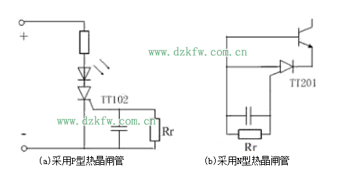 本文介紹了一款直流開關(guān)電源內(nèi)部器件過熱保護電路。該電路采用溫度繼電器來檢測電源裝置內(nèi)部的溫度,當(dāng)電源裝置內(nèi)部產(chǎn)生過熱時,溫度繼電器就動作,使整機告警電路處于告警狀態(tài),實現(xiàn)對電源的過熱保護。如下圖(a)所示,在保護電路中將P型控制柵熱晶閘管放置在功率開關(guān)三極管附近,根據(jù)TT102的特性(由 Rr 值確定該器件的導(dǎo)通溫度, Rr 越大,導(dǎo)通溫度越低),當(dāng)功率管的管殼溫度或者裝置內(nèi)部的溫度超過允許值時,熱晶閘管就導(dǎo)通,使發(fā)光二極管發(fā)亮告警。倘若配合光電耦合器,就可使整機告警電路動作,保護開關(guān)電源。該電路還可以設(shè)計成如圖(b)所示,用作功率晶體管的過熱保護,晶體開關(guān)管的基極電流被N型控制柵熱晶閘管TT201旁路,開關(guān)管截止,切斷集電極電流,防止過熱。