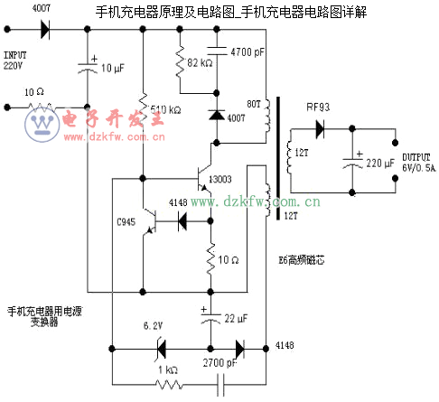 而下方的1KΩ電阻跟串聯的2700pF電容,則是正反饋支路,從取樣繞組中取出感應電壓,加到開關管的基極上,以維持振蕩。右邊的次級繞組就沒有太多好說的了,經二極管RF93整流,220uF電容濾波后輸出6V的電壓。沒找到二極管RF93的資料,估計是一個快速恢復管,例如肖特基二極管等,因為開關電源的工作頻率較高,所以需要工作頻率的二極管。這里可以用常見的1N5816、1N5817等肖特基二極管代替。