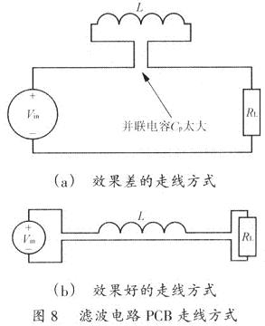 圖8顯示了在一個PCB上Vin通過L至負(fù)載(RL)的不同走線方式。為了降低電感的Cp,電感的二個引腳應(yīng)盡量遠(yuǎn)離。而Vin正極至RL和Vin負(fù)極至RL的走線應(yīng)盡量靠近。