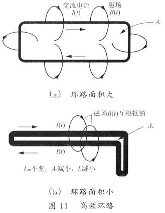 開關(guān)電源中有許多由功率器件所組成的高頻環(huán)路,如果對這△環(huán)路處嬋得不好的話,就會對電源的正常工作造成很大影響。為了減小高頻環(huán)路所產(chǎn)生的電磁波噪音,該環(huán)路的面積應(yīng)該控制得非常小。如圖l1(a)所示,高頻電流環(huán)路面積很大,就會在環(huán)路的內(nèi)部和外部產(chǎn)生很強的電磁于擾。同樣的高頻電流,當(dāng)環(huán)路面積設(shè)計得非常小時,如圖11(b)所示,環(huán)路內(nèi)部和外部電磁場互相抵消,整個電路會變得非常安靜。