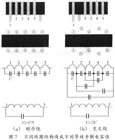 在開關(guān)電源中電感的Cp應(yīng)該控制得越小越好。同時必須注意到,同一電感量的電感會由于線圈結(jié)構(gòu)不同而產(chǎn)生不同的Cp值。圖7就顯示了同一電感量的電感在二種不同的線圈結(jié)構(gòu)下不同的Cp值。圖7(a)電感的5匝繞組是按順序繞制。這種線圈結(jié)構(gòu)的Cp值是l匝線圈等效并聯(lián)電容值(C)的1/5。圖7(b)電感的5匝繞組是按交叉順序繞制。其中繞組4和5放置在繞組1、2、3之間,而繞組l和5非常靠近。這種線圈結(jié)構(gòu)所產(chǎn)牛的Cp是1匝線圈C值的兩倍。