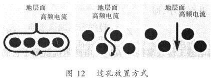 許多設(shè)計人員喜歡在多層PCB卜放置很多過孔(VIAS)。但是,必須避免在高頻電流返同路徑上放置過多過。否則,地層上高頻電流走線會遭到破壞。如果必須在高頻電流路徑上放置一些過孔的活,過孔之間可以留出一空間讓高頻電流順利通過,圖12顯示了過孔放置方式。