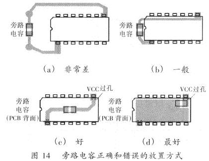 旁路電容(Decouple)的放置也要考慮到它的串聯(lián)電感值。旁路電容必須是低阻抗和低ESL乩的瓷片電容。但如果一個高品質(zhì)瓷片電容在PCB上放置的方式不對,它的高頻濾波功能也就消失了。圖14顯示了旁路電容正確和錯誤的放置方式。