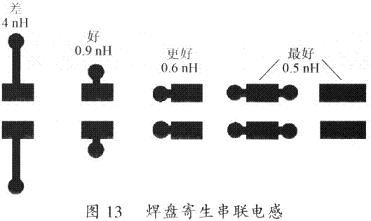 設(shè)計者同時應(yīng)注意不同焊盤的形狀會產(chǎn)生不同的串聯(lián)電感。圖13顯示了兒種焊盤形狀的串聯(lián)電感值。