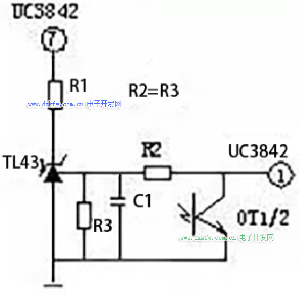 基本原理:當(dāng)輸出電路短路,輸出電壓消失,光耦OT1不導(dǎo)通,UC3842①腳電壓上升至5V左右,R1與R2的分壓超過(guò)TL431基準(zhǔn),使之導(dǎo)通,UC3842⑦腳VCC電位被拉低,IC停止工作。UC3842停止工作后①腳電位消失,TL431不導(dǎo)通UC3842⑦腳電位上升,UC3842重新啟動(dòng),周而復(fù)始。當(dāng)短路現(xiàn)象消失后,電路可以自動(dòng)恢復(fù)成正常工作狀態(tài)。