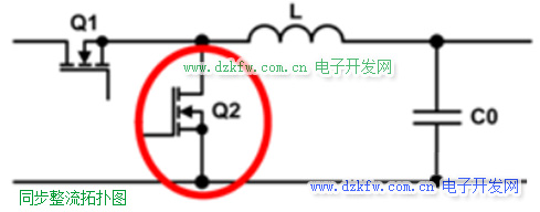 若在電路中續流回路中使用的也是MOS管(Q2),即上下管都是MOS管,因為MOS管本身是需要外控制的元器件,整流過程中必須根據電源的開關時序同步控制Q1與Q2,所以該電路為同步,同步電路如圖2所示: