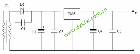 經(jīng)檢查,供光譜儀主板的直流5V電源僅剩2.3伏左右,脫開5V直流電源的負(fù)載,通電再次測量5V直流電源,這時則有5V,初步判斷此5V直流電源帶載能力差,拆開電源外殼進(jìn)行檢修,由于沒有帶負(fù)載時,通電有直流5V輸出,故重點檢查次級線圈側(cè)的輸出整流電路,給5伏電源接上假負(fù)載通電進(jìn)行測量發(fā)現(xiàn)三通穩(wěn)壓7805的1、2腳之間電壓為5.2伏,2、3腳之間卻剩2.3伏。如下圖,故判斷三通穩(wěn)壓管7805性能變壞,更換三通穩(wěn)壓管7805故障解決。