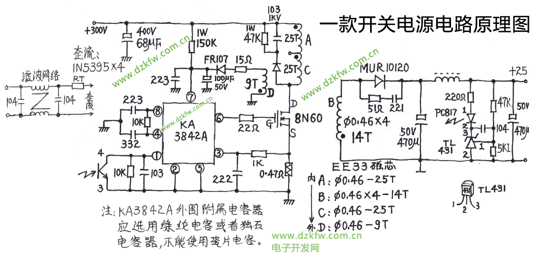 4、在開關(guān)電源維修實踐中,有許多開關(guān)電源采用UC38××系列8腳PWM組件,大多數(shù)電源不能工作都是因為電源啟動電阻損壞,或芯片性能下降。當(dāng)R斷路后無VC,PWM組件無法工作,需更換與原來功率阻值相同的電阻。當(dāng)PWM組件啟動電流增加后,可減小R值到PWM組件能正常工作為止。在修一臺GE DR電源時,PWM模塊為UC3843,檢測未發(fā)現(xiàn)其他異常,在R(220K)上并接一個220K的電阻后,PWM組件工作,輸出電壓均正常。有時候由于外圍電路故障,致使VR端5V電壓為0V,PWM組件也不工作,在修柯達(dá)8900相機電源時,遇到此情況,把與VR端相連的外電路斷開,VR從0V變?yōu)?V,PWM組件正常工作,輸出電壓均正常。