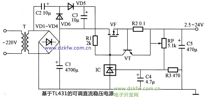 TL431是具有TO-92和DIP-8兩種封裝的精密型可調(diào)穩(wěn)壓集成電路,芯片具有體積小、基準(zhǔn) 電壓精密可調(diào),輸出電流大、性能優(yōu)良等特點(diǎn),可廣泛用于單片精密開關(guān)電源或精密線性穩(wěn) 壓電源中。利用TL431構(gòu)成的可調(diào)直流穩(wěn)壓電源典型電路如圖1所示,該電路具有輸出電流大 (最大輸出電流為6A)、電路簡(jiǎn)單、使用安全可靠等特點(diǎn),其輸出電壓可在2.5~24V之間連 續(xù)可調(diào)。適用于中、小功率用電設(shè)備、設(shè)施用電。