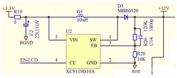 這個芯片把三極管集成到芯片內部,因此應用比較簡單。因為它能提供的電流很小,是給lcd供電的。+12V后面還有一個10uF/25V的電容。