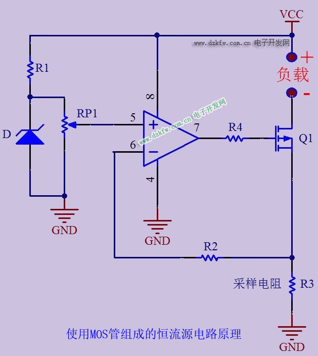(2)電阻R2起緩沖限流的作用,一般選取1K~100K之間;通過調節電位器RP即可改變恒流源電流的大小,可以根據實際需求選擇合適的電位器及電阻大小;穩壓管D的作用是為電位器提供恒定的電壓,防止因為電源的波動而引起運放正輸入端電壓不穩定,導致負載電流有波動。