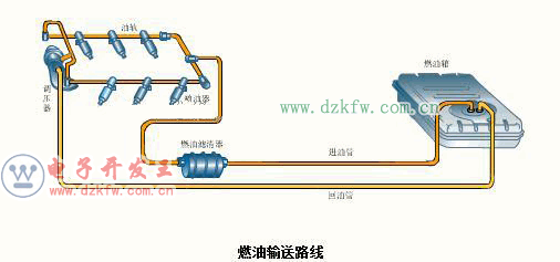 電控汽油噴射系統的燃油供給系統由汽油箱、電動汽油泵、汽油濾清器、燃油分配管、油壓調節器、噴油器、冷起動噴嘴和輸油管等組成 ,有的還設有油壓脈動緩沖器。