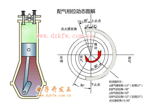 配氣定時就是進,排氣門的實際開閉時刻,通常用相對上,下止點曲拐位置的曲軸轉角的環形圖來表示。