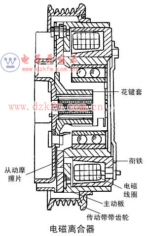 電磁離合器安裝在傳動帶輪中。電控單元根據發動機 工況的需要,發出接通或切斷電磁離合器電源的指令,以控制增壓器的工作。當接通電源時,電磁線圈通電,主動板吸引從動摩擦片,使離合器處于接合狀態,增壓器工作。當切斷電源時,電磁線圈斷電,主動板與從動摩擦片分開,增壓器停止轉動。