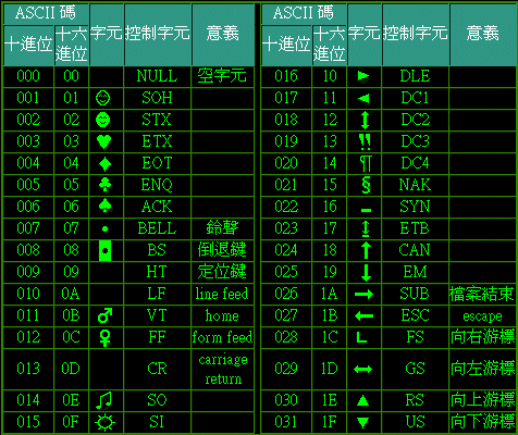 | 十進位 | 十六進位 | 十進位 | 十六進位 | 十進位 | 十六進位 | 十進位 | 十六進位 | |||||||