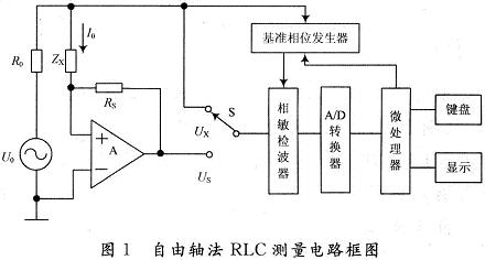 基于數(shù)字鑒相的自由軸法RLC測量系統(tǒng)構(gòu)成如圖1所示,主要由正弦信號源U0、前端測量電路、相敏檢波器、A/D轉(zhuǎn)換器、微處理器、基準(zhǔn)相位發(fā)生器以及鍵盤、顯示電路等組成。