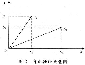 圖1中,被測信號與相位參考基準(zhǔn)信號經(jīng)過相敏檢波器后,輸出就是被測信號在坐標(biāo)軸上的投影分量。相位參考基準(zhǔn)代表著坐標(biāo)軸的方向,為了得到每一被測電壓(US或UX)在兩坐標(biāo)軸上的投影分量,基準(zhǔn)相位發(fā)生器需要提供兩個相位相差90°的相位參考基準(zhǔn)信號。需要指出的是在自由軸法中,相位參考基準(zhǔn)與US沒有確定關(guān)系,可以任意選擇,即x,y坐標(biāo)軸可以任意選擇,只需保持兩坐標(biāo)軸準(zhǔn)確正交90°。UX,US和坐標(biāo)軸的關(guān)系如圖2所示。