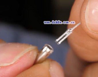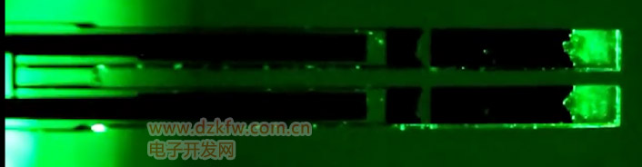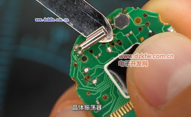 晶振中的石英晶體為一薄片,薄片兩端涂有導(dǎo)電的銀層,并連出兩個(gè)電極,如下圖1-1所示為電子手表中所用晶振的內(nèi)部晶片。