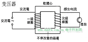 是由一個原線圈與一個或多個副線圈在絕緣骨架加上硅鋼片鐵芯繞制成的;原理是電磁感應現象,即電生磁、磁再生電的原理;原線圈輸入的是原來的交流電,經過線圈變化的電流產生變化的磁場,變化的磁場穿過副線圈,于是便產生了變化電流從副線圈輸出。變壓器轉換的是交變電流(交流電)。