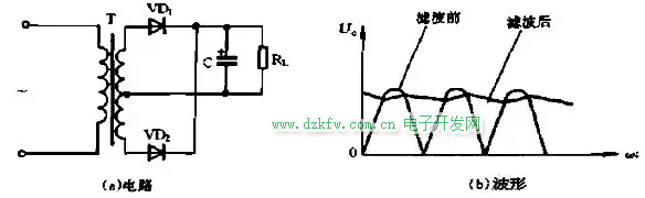 可見,在整個v1周期內,流過二極管的電流iV1、iV2疊加形成全波脈動直流電流iL,于是RL兩端產生全波脈動直流電壓vL。故電路稱為全波整流電路。。