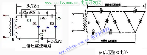 在一些需用高電壓、小電流的地方,常常使用倍壓整流電路。倍壓整流,可以把較低的交流電壓,用耐壓較低的整流二極管和電容器,“整”出一個較高的直流電壓。倍壓整流電路一般按輸出電壓是輸入電壓的多少倍,分為二倍壓、三倍壓與多倍壓整流電路。