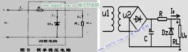 圖2為簡單穩壓電路,由限流電阻 Rs和穩壓二極管Dz組成。輸出端輸出穩壓電壓。當輸入電壓ui或輸出電流I0在一定范圍內升高或降低時,具有穩壓特性的Dz上的電壓 。