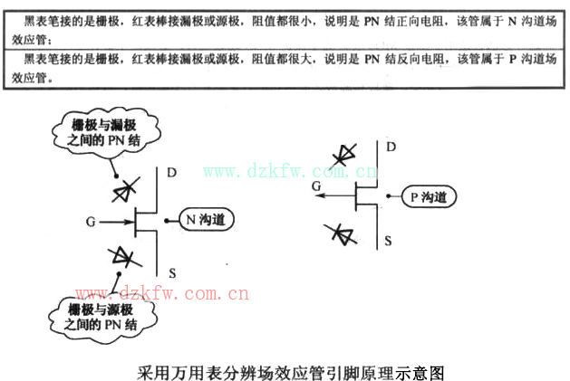 利用G極和S極之間,G極和D極之間為一個PN結的原理。如下圖所示,根據PN結的正、反向電阻相差很大的特點可以分辨出柵極,并且可以分辨出是N溝道還是P溝道的場效應管。