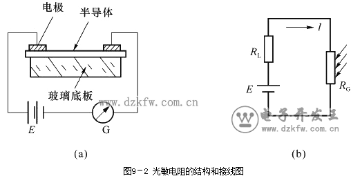 光敏電阻又稱為光導,幾乎都是用半導體材料制成。光敏電阻的結構和接線圖如圖9‐2所示。