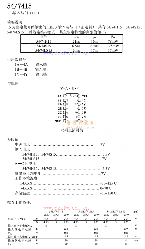 15 為集電集開路輸出的三組 3 輸入端與門(正邏輯),共有 54/74H15、54/74S15、