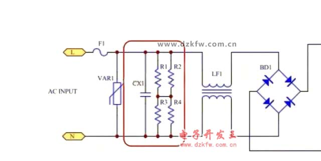 X電容用來消除差模干擾。主要是起濾波作用,與共模電感匹配,并聯在輸入的兩端,濾除L、N線之間的差模信號。通常選用耐紋波電流比較大的聚脂薄膜類電容,體積較大其允許瞬間充放電的電流比較大,而其內阻相應較小。另外X電容也會采用塑封的方形高壓CBB電容,CBB電容不但有更好的電氣性能,而且與電源的輸入端并聯可以有效的減小高頻脈沖對電源的影響。